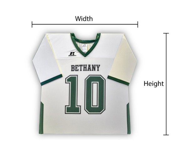 Measure the length and width of your jersey as per image, rounding up to the nearest whole inch.